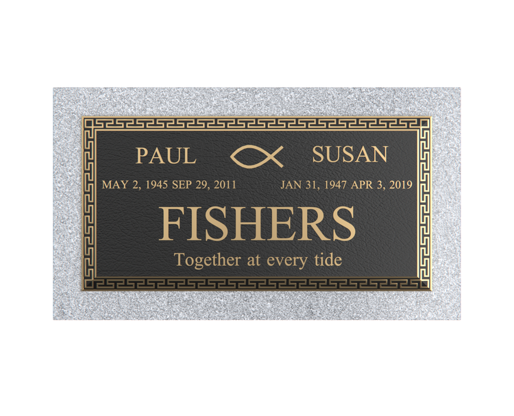 A premium companion bronze memorial plaque on a grey granite base, featuring a classic leather-textured background framed by an elegant Greek Key border. The Ichthys (Christian fish) symbolizes faith, unity, and everlasting love. Precision-cast for outdoor durability and long-term legibility. Finish upgrades include clear-coat luster levels, brushed finishing, and edge-color accents for a tailored, refined look. Available without granite upon request.