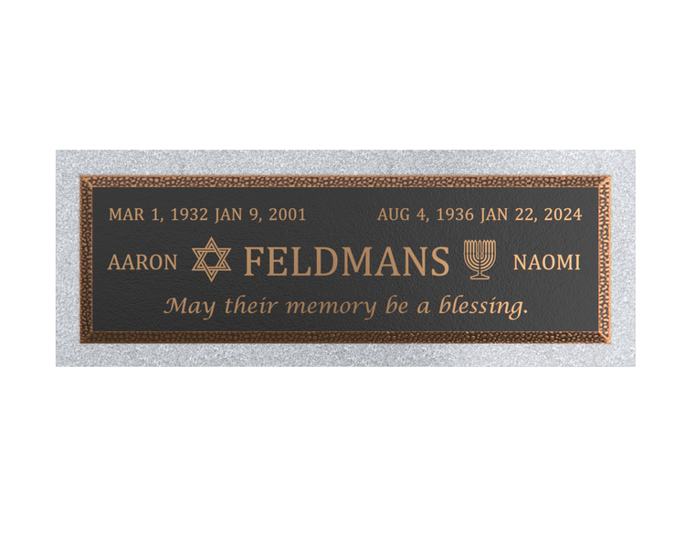 A premium bevel bronze memorial plaque on a grey granite base, featuring a classic leather-textured background framed by a refined hammered border. The Star of David and menorah—timeless symbols of Jewish faith and continuity—create a dignified tribute with long-term legibility. Precision-cast for outdoor durability. Finish upgrades include clear-coat luster levels, brushed finishing, and edge-color accents for a tailored look. Available without granite upon request.