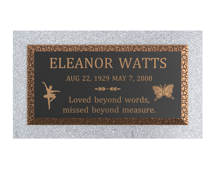 A premium bevel-edge bronze memorial plaque on a granite base, pairing a classic leather-textured background with an ornate hammered border. Symbolic artwork—a butterfly for transformation and spirit, and a dancer for grace and vitality—creates an elegant, uplifting tribute. Precision-cast for outdoor durability and long-term legibility. Finish upgrades include clear-coat luster levels, brushed finishing, and edge-color accents for a tailored look. Available without granite upon request.