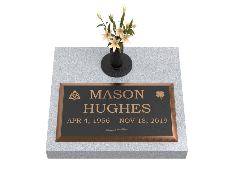 A premium bronze memorial plaque on a grey granite base, crafted with a classic leather-textured background and polished border. Symbolic Celtic knot and clover engravings honor heritage, unity, and good fortune, while the coordinated bronze vase (optional) adds practical elegance. Precision-cast for outdoor durability and long-term legibility. Finish upgrades include clear-coat luster levels, brushed finishing, and edge-color accents for a refined, custom look. Available without granite upon request.