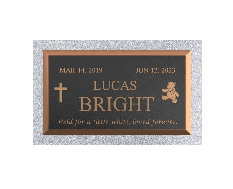 A premium children’s bronze memorial plaque on a granite base, featuring a classic leather-textured background and polished bevel edges for elegant contrast. Engraved cross and teddy bear symbols honor faith, innocence, and eternal love. Precision-cast for outdoor durability and long-term legibility. Finish upgrades include clear-coat luster levels, brushed finishing, and edge-color accents for a tailored look. Available without granite upon request.