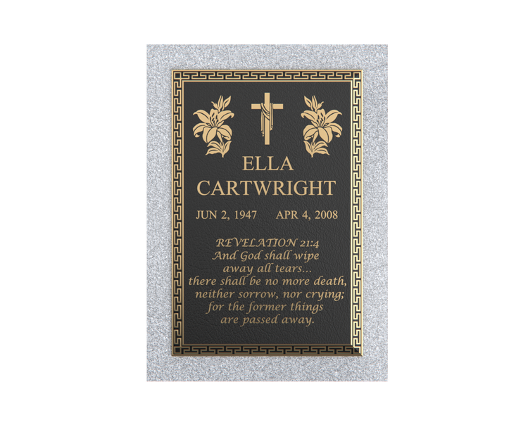 A premium bronze memorial plaque on a granite base, crafted with a classic leather-textured background and framed by an elegant Greek Key border. Engraved lilies and a cross symbolize purity, faith, and eternal remembrance. Precision-cast for outdoor durability and long-term legibility. Finish upgrades include clear-coat luster levels, brushed finishing, and edge-color accents for a tailored look. Available without granite upon request.