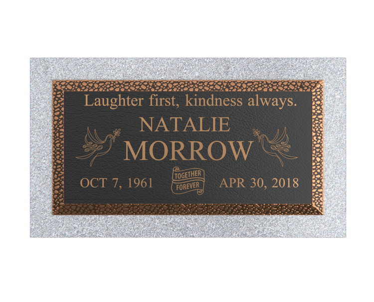 Options: with/without granite; clear-coat luster levels; brushed finishing; edge-color accents; hammered and other border styles; emblem/engraving choices (doves with olive branches, cross, heart, florals, etc.); scrolls for dates (optional); custom inscription layout (names, dates, epitaph); optional photo cameo; optional bronze flower vase (with or without ring).