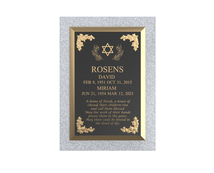 Options: with/without granite; clear-coat luster levels; brushed finishing; edge-color accents; border styles (gold-toned, hammered, Greek Key, woodgrain); emblem/engraving choices (Star of David, leaves, menorah, etc.); scrolls for dates (optional); Hebrew/English inscription layout; custom epitaph; optional photo cameo.