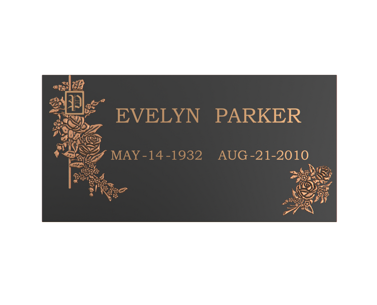 A beautifully crafted flat bronze memorial plaque featuring a monogram initial framed with rose engravings. The floral detailing and classic styling create a dignified, loving tribute. Precision-cast for outdoor durability and long-term legibility. Finish upgrades include clear-coat luster levels, elegant brushed finishing, and edge-color accents for a tailored look. Available with or without a granite base upon request.
