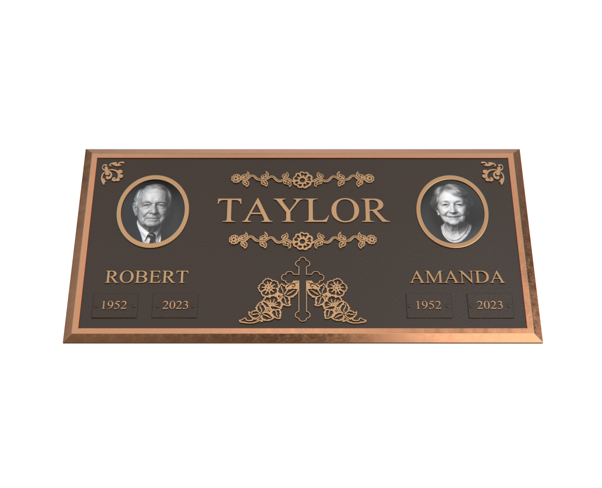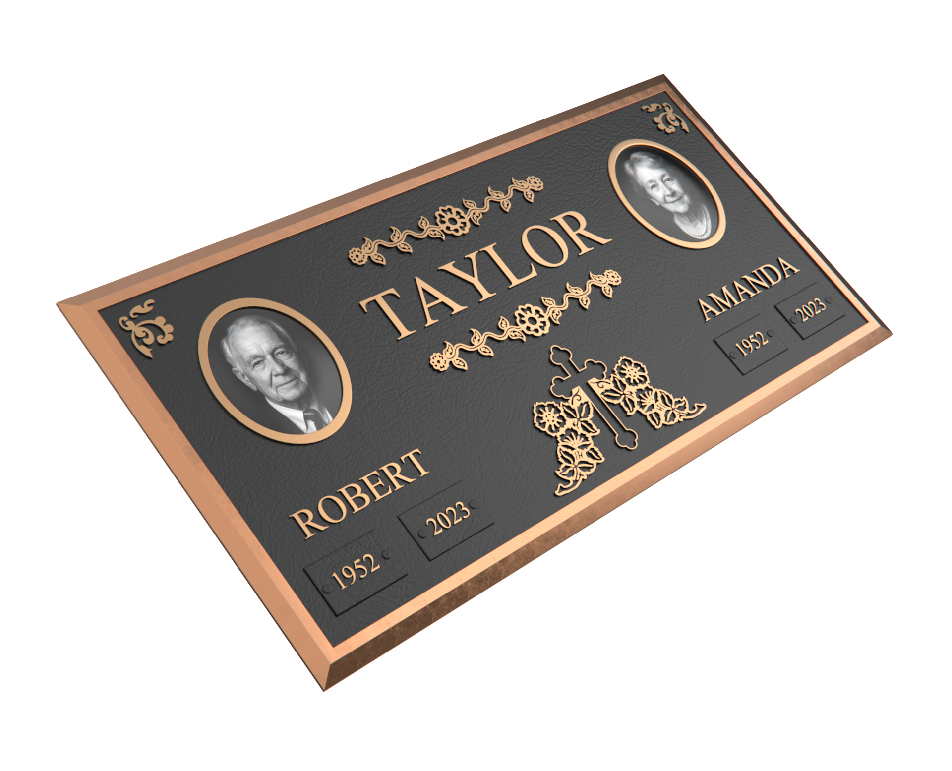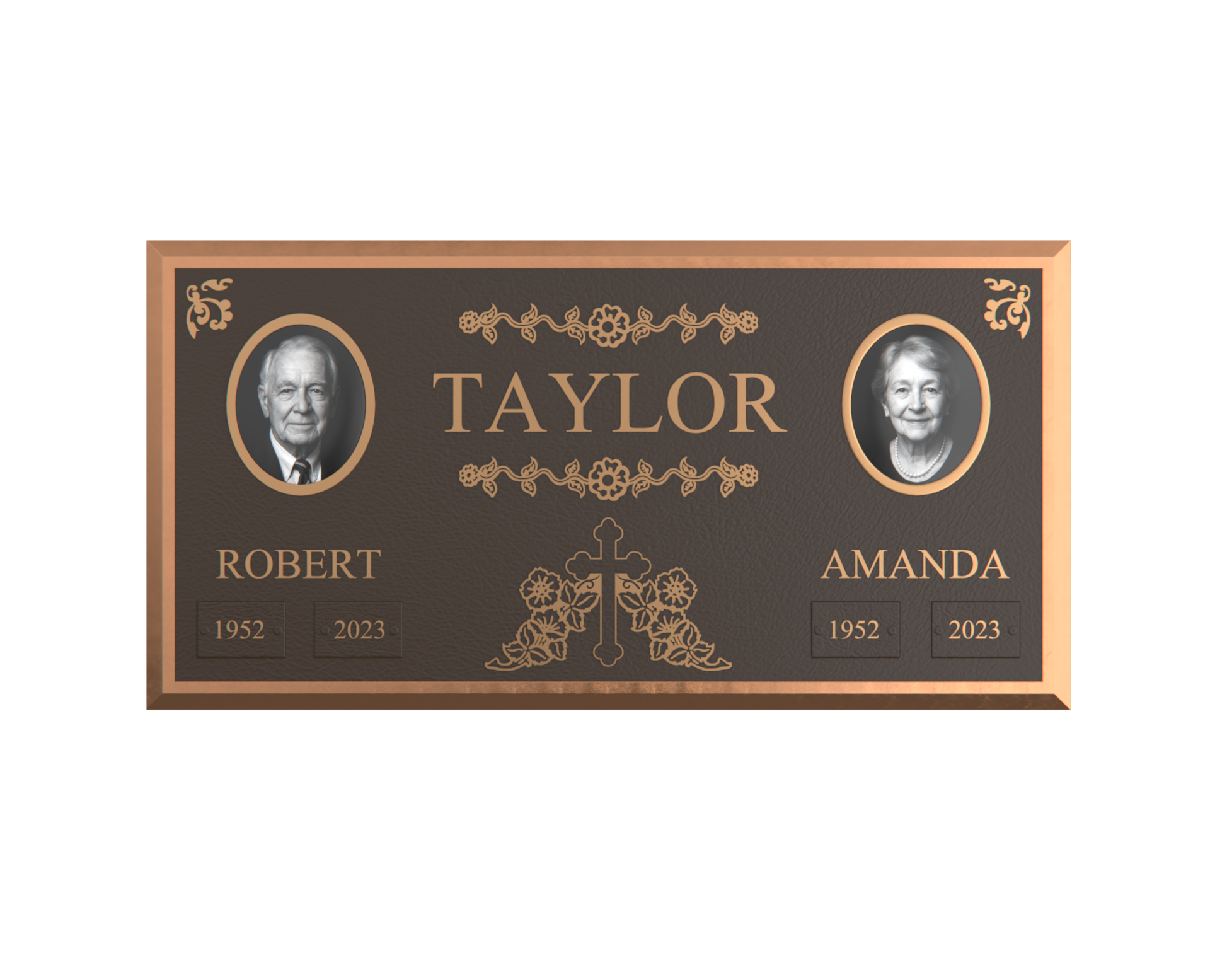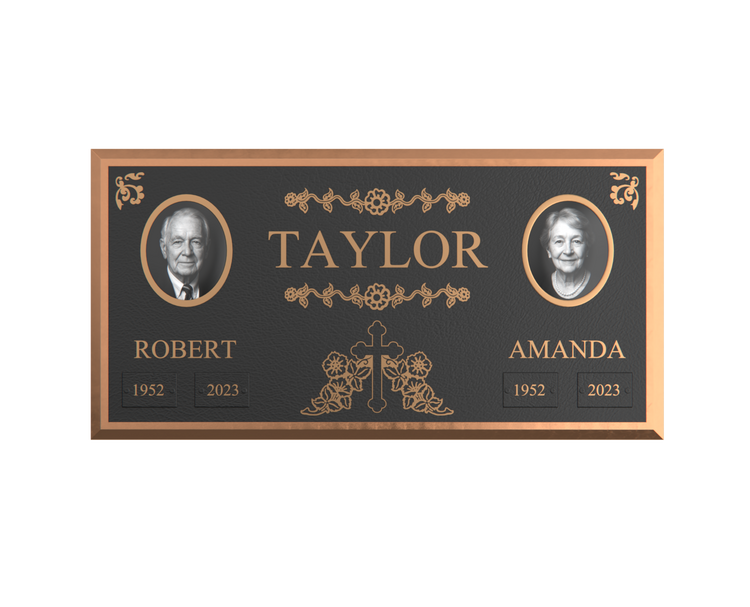 A luxury bronze companion memorial plaque featuring dual portrait spaces, a gold-accented frame, and engraved floral and cross motifs—a refined tribute to love and unity. Precision-cast for outdoor durability and long-term legibility. Finish upgrades include clear-coat luster levels, elegant brushed finishing, and edge-color accents for a tailored look. Optional: add a porcelain (ceramic) photo insert in oval or rectangular format. Available with or without a granite base upon request.