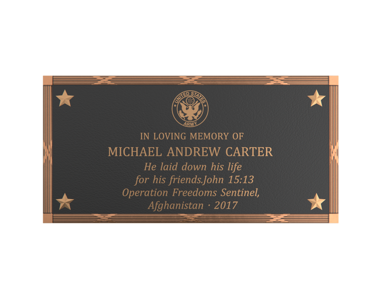 A premium flat bronze memorial plaque featuring a leather-textured surface and star-accented border, designed to reflect patriotism and respect. Personalize with military emblems and custom inscriptions. Precision-cast for outdoor durability and long-term legibility. Finish upgrades include clear-coat luster levels, brushed finishing, and edge-color accents for a tailored look. Available with or without a granite base upon request.