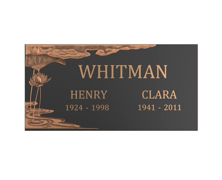 A refined flat bronze memorial plaque featuring a soft leather-textured background and an elegant lotus motif—symbolizing peace, unity, and eternal love. Precision-cast for outdoor durability and long-term legibility. Finish upgrades include clear-coat luster levels, elegant brushed finishing, and edge-color accents to complete your custom expression. Available with or without a granite base upon request.
