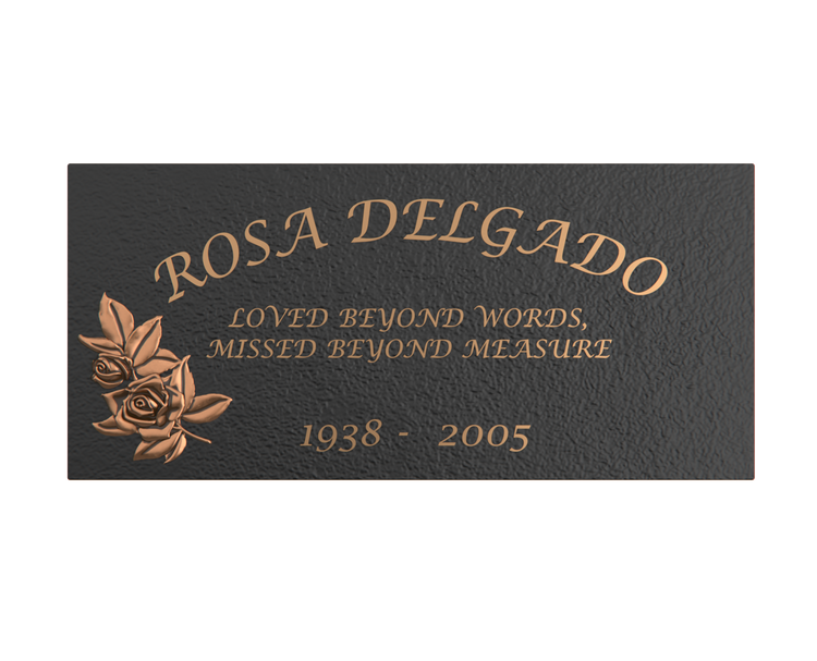 A timeless flat bronze memorial plaque featuring an elegant floral rose engraving and a smooth background—an understated tribute to enduring memory. Precision-cast for outdoor durability and long-term legibility. Finish upgrades include clear-coat luster levels, refined brushed finishing, and edge-color accents for a tailored look. Available with or without a granite base upon request.
